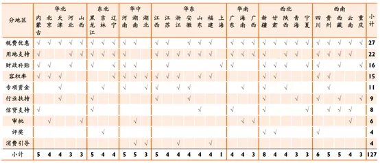 從內容看,各省市裝配式支持政策類型主要包括:用地支持、財政補貼、專項資金、稅費優惠、容積率、評獎、信貸支持、審批、消費引導、行業扶持等10個小類。