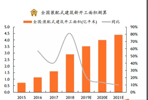 3、未來我國裝配式建筑市場規模可達萬億元受益國家政策推動,2018年我國裝配式建筑新開工面積達2.9億平方米,同比增長81%(占新開工面積13.9%),中性預測下,我們預計2019~2021年國內新開工房屋面積為20.1億平米、19.5億平米、19.1億平米,假設裝配式建筑占比為17.5%、20.5%、23%,對應裝配式建筑新開工面積分別為3.5億平米、4.0億平米和4.4億平米,按每平方米造價2300元計算,2019~2021年我國裝配式建筑市場規模分別可達8000億元、9200億元和10000億元(建筑整體建安工程造價,含非裝配式建筑部分)。