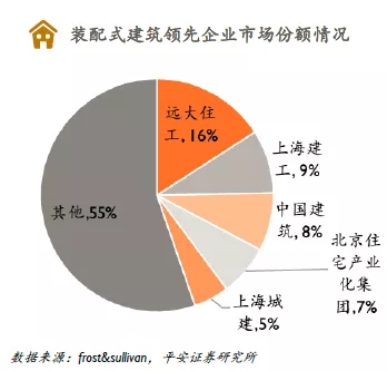 2、從企業看,國資建筑大佬占據市場從施工企業看,由于裝配式建筑并無特殊資質要求,具備建筑工程施工總承包資質(數量龐大)的建工企業均可承接相關建設工程,其中中國建筑、上海建工等經營市場位于東部發達地區的龍頭企業優先受益。2017年,按PC裝配式建筑構件收入計,遠大住工是中國PC裝配式建筑構件市場的最大參與者,市場份額達到15.9%。市場競爭對手包括大型國有建筑企業、地方構件制造企業和合資構件制造企業。其他主要參與者包括上海建工、中國建筑、北京住宅產業化集團、上海城建等。