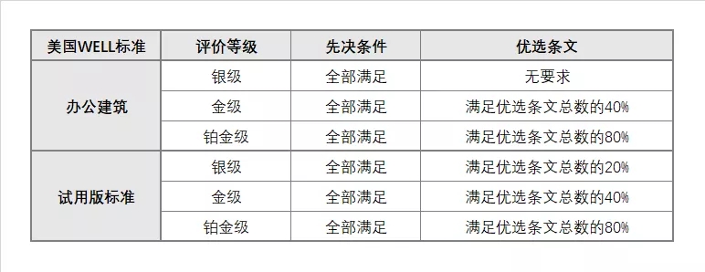美國WELL建筑標準包括空氣(Air)、水(Water)、營養(Nourishment)、光(Light)、健身(Fitness)、舒適(Comfort)、精神(Mind)7大類別,其中先決條件(必須滿足)41條,優選項61項,合計102個條款。與前兩者不同的是,WELL標準不設置總分數,而是通過判斷滿足的條款數量來劃分等級。